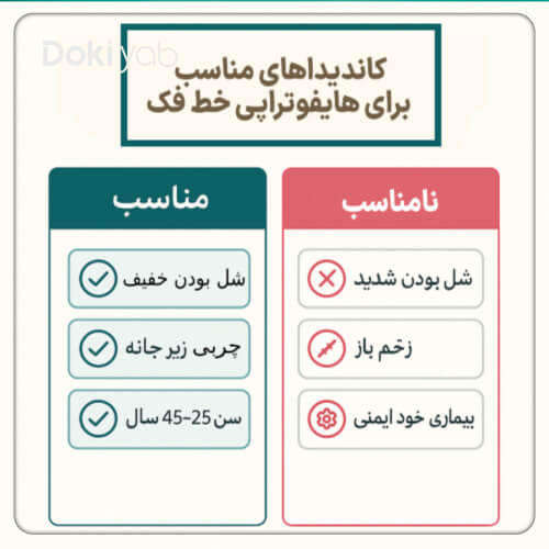 برای افرادی که زخم، عفونت یا آکنه شدید روی صورتشان است، ایمپلنت یا کاشت دندان فلزی دارند یا مشکل افتادگی پوستشان شدید است، زاویه دار کردن فک با هایفوتراپی موثر نیست و نتیجه خوبی نمیدهد. همچنین اگر بیماریهای خود ایمنی دارید هم نباید هایفو انجام دهید. اگر به فکر انجام زاویه سازی فک با هایفوتراپی هستید، باید در ابتدا برای پیشگیری از بروز هرگونه مشکل بدانید که این روش برای چهکسانی مناسب و کارآمد نیست.